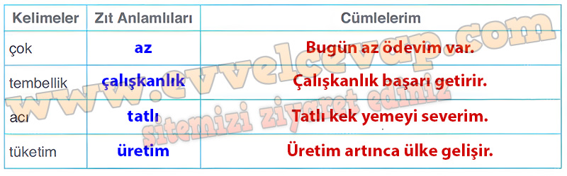Soru: 7) Metinden alınan aşağıdaki kelimelerin zıt anlamlılarını yanlarına yazınız. Bu kelimeleri birer cümlede kullanınız.