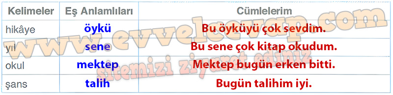 Soru: 8) Metinden alınan aşağıdaki kelimelerin eş anlamlılarını yanlarına yazınız. Bu kelimeleri birer cümlede kullanınız.