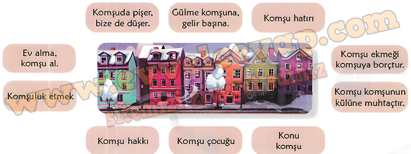Soru: a) Bu binalardan birinde oturduğunuzu hayal ediniz. Hangi binada ve kaçıncı katta oturduğunuzu, diğer binalarda oturan komşularınızı ve mahallenizi anlatan bir konuşma yapınız. Konuşmanızda yukarıdaki söz varlığından yararlanınız.