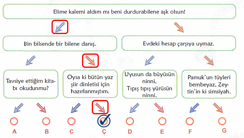 Soru: 6) Aşağıdaki cümleleri yazım kuralları açısından inceleyiniz. Cümle doğru yazılmışsa mavi, yanlış yazılmışsa kırmızı oku takip ediniz. Ulaştığınız çıkışı işaretleyiniz.