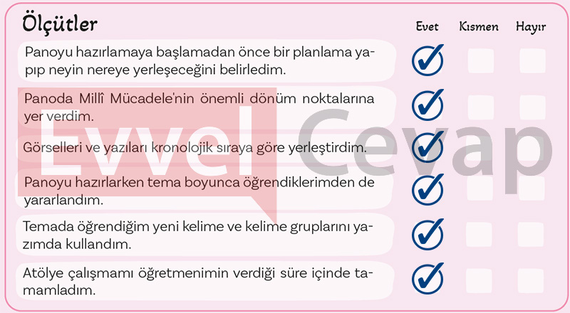 Soru: Yaptığınız sınıf panosunu aşağıdaki ölçekte verilen ölçütlere göre değerlendiriniz. Ölçeğin sonuçlarından hareketle güçlü yönlerinizi belirleyiniz. Gelişmeye açık yönlerinizi öğretmeninizin geri bildirimleriyle sonraki yazma etkinliklerinde geliştirmeye çalışınız.