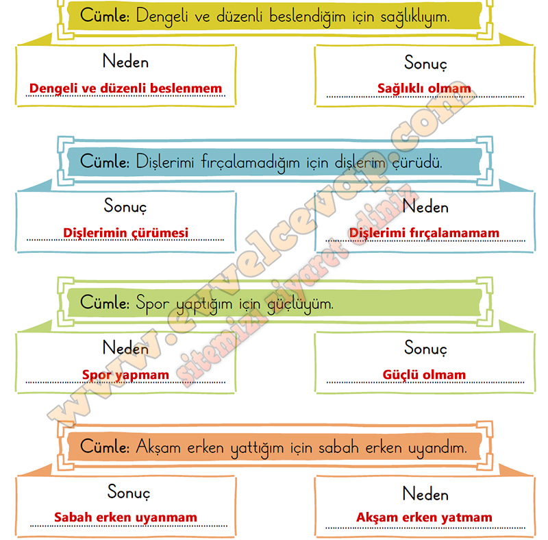 Soru: Cümlelerdeki neden sonuç ilişkisini örnekteki gibi yazınız.