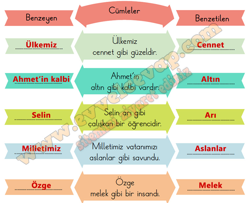 Soru: Cümlelerdeki kendisine benzeyen ve kendisine benzetilen nesneleri tabloya yazınız.