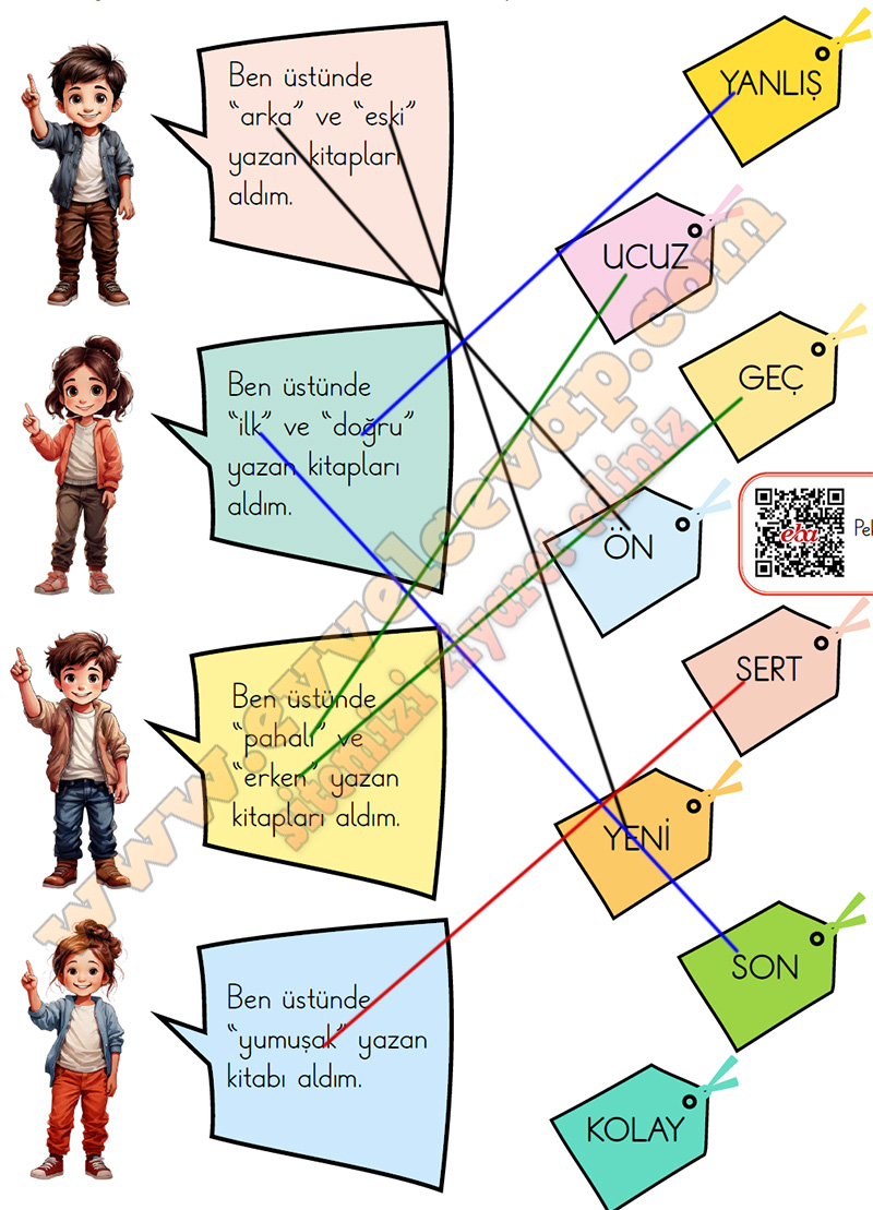 Soru: Çocuklar kütüphaneden kitap alırken kitapların adını söylemek yerine kitaplardaki etiketlerde yazan sözcüklerin zıt anlamlarını söylemiştir. Çocuklarla aldıkları kitapların etiketlerini eşleştiriniz.