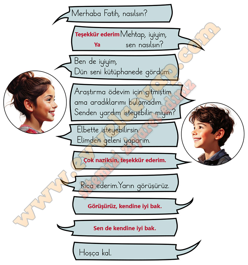 Soru: 1) Mehtap ve Fatihlin konuşmalarında eksik bırakılan yerlere uygun nezaket ifadelerini yazınız.