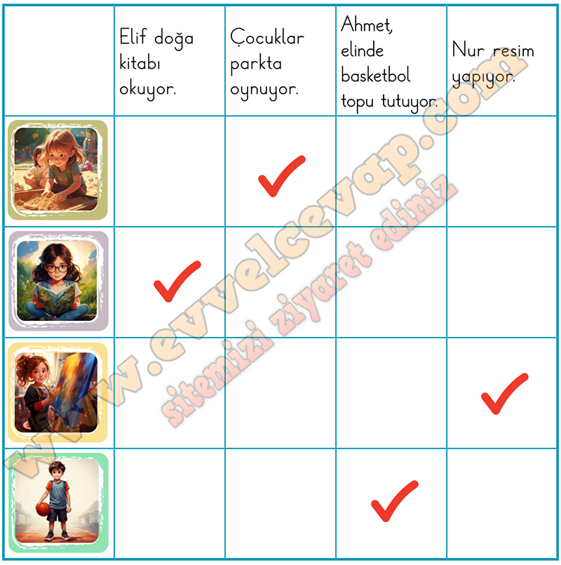 Soru: Görselleri inceleyiniz. Görsellerle uygun olan cümleleri örnekteki gibi işaretleyiniz.
