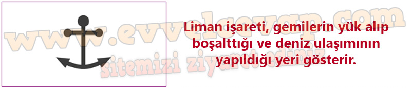 Soru: Sınıfınızda ve kitaplarınızda bulunan haritalardaki sembol ve işaretleri inceleyiniz. Yukarıdaki şemada bulunmayan bir harita işaretini çizerek ne anlama geldiğini yazınız.