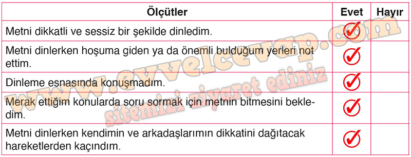 Soru: Metni dinlerken kurallara uyup uymadığınızı aşağıdaki ölçütlere göre değerlendiriniz.