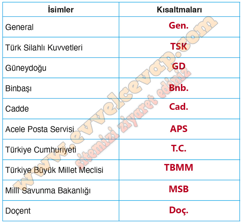 Soru: 10) Aşağıda verilen isimlerin kısaltmalarını karşılarına yazınız.
