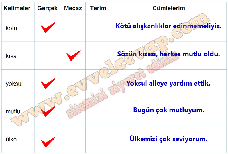 Soru: 6) Tabloda verilen kelimeleri okuduğunuz metinde bulunuz. Kelimelerin içinde bulunduğu cümlelerden faydalanarak kelimelerin kullanıldıkları anlamı işaretleyiniz. Bu kelimelerin içinde geçtiği cümleler kurunuz.