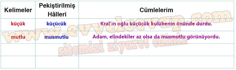 Soru: 7) Pekiştirmeli kelimelerin nasıl oluşturulduğunu hatırlayınız. Okuduğunuz metinden pekiştirilebilecek dört kelime seçerek bu kelimeleri pekiştiriniz. Pekiştirdiğiniz kelimeleri birer cümlede kullanınız.