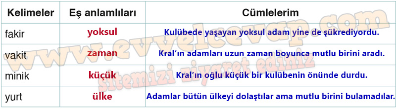 Soru: 8) Aşağıda verilen kelimelerin eş anlamlılarını metinde bulunuz. Bu kelimeleri cümle içerisinde kullanarak yazınız.