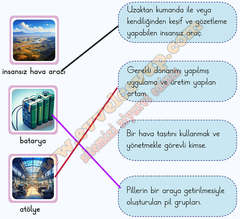 Soru: Görsellerden hareketle sözcüklerin ve sözcük grubun anlamlarını tahmin edip sözcükleri anlamlarıyla eşleştiriniz.