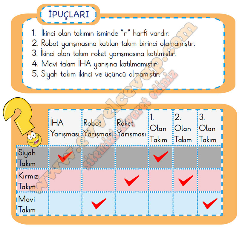 Soru: TEKNOFEST’e katılan takımlarla ilgili bilgiler verilmiştir. Her takım bir kategoride derece almıştır. Takımların hangi kategoride yarıştığını ve sıralamalarını ipuçlarından yararlanarak bulunuz.