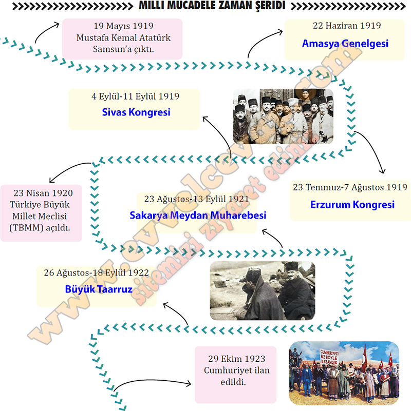 Soru: Aşağıda, Mustafa Kemal Atatürk’ün 19 Mayıs 1919’da Samsun’a çıkışıyla başlayan Millî Mücadele Dönemi’nde yaşanan belli başlı olaylardan bazılarıyla ilgili bilgiler yer almaktadır. Bu bilgilerden hareketle hakkında bilgi verilen olayları “Millî Mücadele Zaman Şeridi” üzerinde renkli kutularla gösterilen yerlere yazınız.