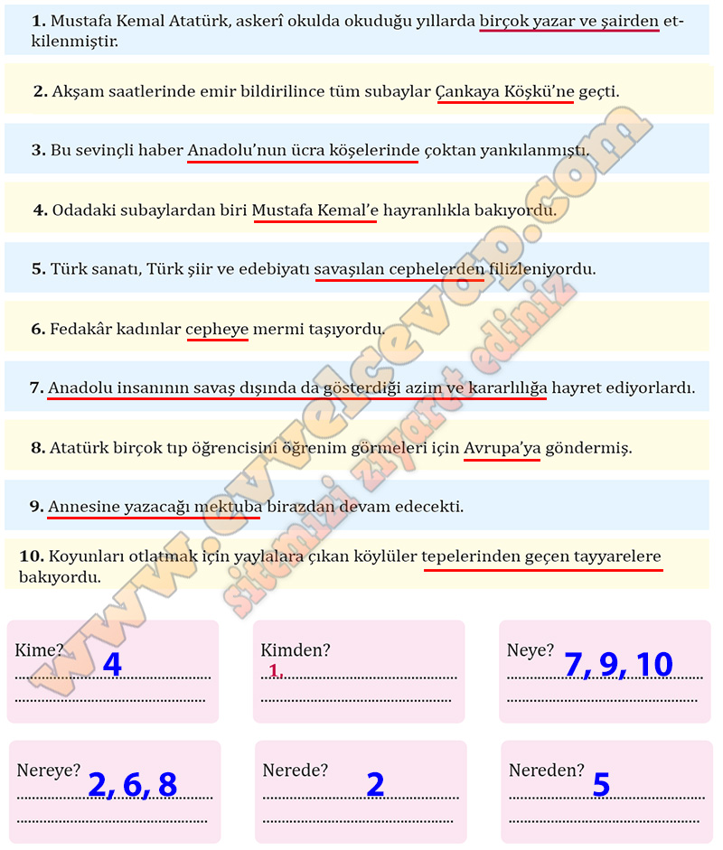 Soru: Aşağıdaki cümlelerde yer tamlayıcılarının altlarını örnekteki gibi çizerek gösteriniz. Yer tamlayıcılarını bulmak için yükleme hangi soru ifadesini yönelttiyseniz ilgili bölüme cümle numarasını yazınız.