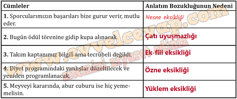 Soru: Verilen cümlelerdeki anlatım bozukluklarının nedenlerini yanlarındaki alana örnekteki gibi yazınız.