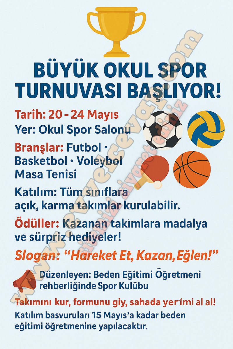 Soru: Okulunuzda bir spor turnuvası düzenleneceğini hayal ediniz. Bu spor turnuvası ile ilgili bir afiş tasarlayarak afişinizi sınıf panosunda sergileyiniz. Hayal ettiğiniz spor turnuvasını gerçekleştirmek için beden eğitimi öğretmeninizle görüşebilirsiniz.