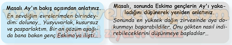 Soru: “Ay Avcısı Eskimolar” metnini dilerseniz tekrar okuyunuz. Aşağıdaki durumlardan birini seçiniz. Seçtiğiniz duruma göre masalı yeniden anlatınız.