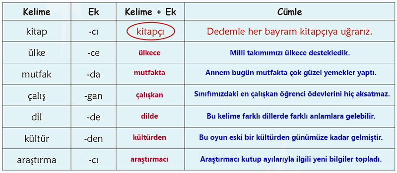 Soru: b) Tabloda verilen kelimelere yanlarındaki sütunda bulunan ekleri getiriniz. Kelimeleri ek almış haliyle örnekteki gibi cümle içinde kullanınız.