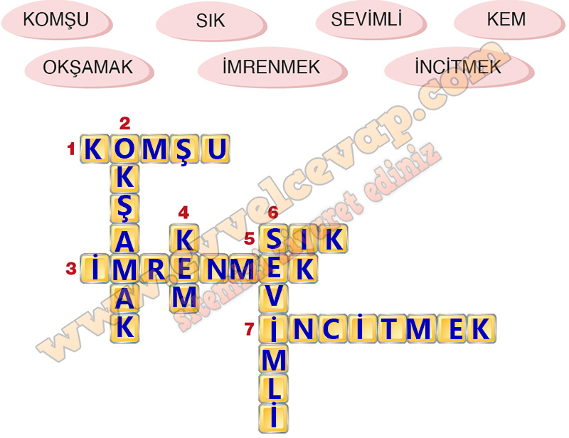 Soru: Aşağıdaki kelimeleri, anlamlarından yola çıkarak bulmacadaki yerlerine yazınız. Anlamını öğrendiğiniz kelimelerden beş tanesini birer cümlede kullandıktan sonra sözlüğünüze yazınız.