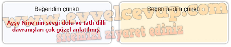 Cevap: Görsel metne uygundur çünkü Ayşe Nine’nin çocuklarla sevgi dolu ilişkisini gösteriyor. Ben olsaydım şiir için Ayşe Nine’nin çocuklara kurabiye ikram ettiği bir görsel çizerdim. Böylece onun sevecenliğini ve tatlı dilli oluşunu daha iyi yansıtabilirdim.