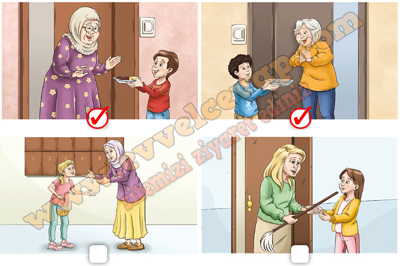 Cevap: Bu görsellerdeki durumların çoğunu yaşadım. Özellikle komşularımızla birbirimize yemek götürür, bir şey ödünç alırız. Komşuluk çok önemlidir çünkü zor zamanlarda ilk yardıma koşan komşulardır. Atalarımız “Komşu komşunun külüne muhtaçtır.” demiştir. Bu yüzden komşularımıza saygılı, yardımsever ve güler yüzlü olmalıyız.