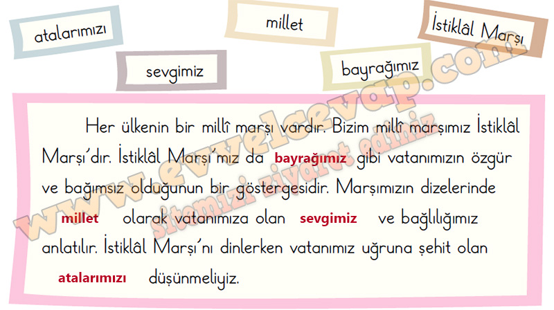 Cevap: İstiklâl Marşımızın ilk dört kıtasını dikkatle okudum ve ezberledim. Marşımız vatan sevgisini, bağımsızlık inancını ve milletimizin kahramanlığını anlatıyor. Onu coşkuyla ve gururla söylüyorum.