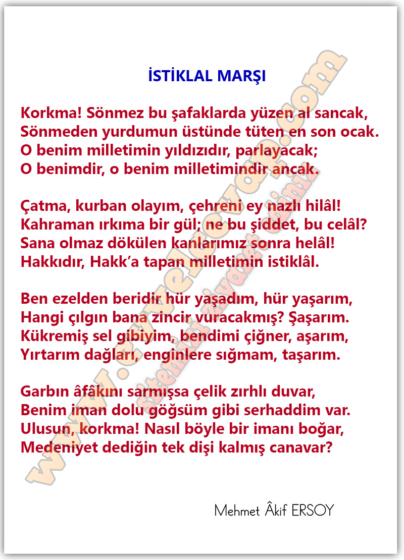 Soru: İstiklâl Marşımızın ilk dört kıtasını noktalama işaretlerine dikkat ederek okuyunuz ve ezberleyiniz.