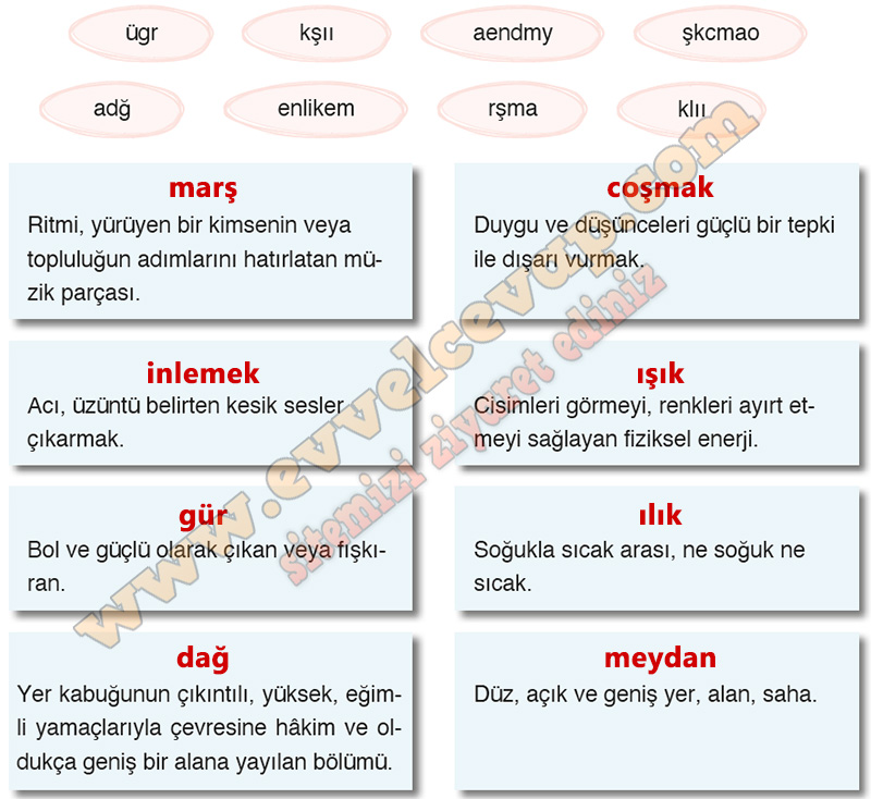 Soru: Aşağıda metinden alınan bazı kelimelerin harfleri karıştırılarak verilmiştir. Harfleri doğru sıraya koyarak kelimeleri bulunuz. Metinden hareketle kelimelerin anlamlarını tahmin ediniz. Kelimeleri anlamlarının bulunduğu kutucuklara yazınız. Bu kelimelerden beşini birer cümlede kullanınız.