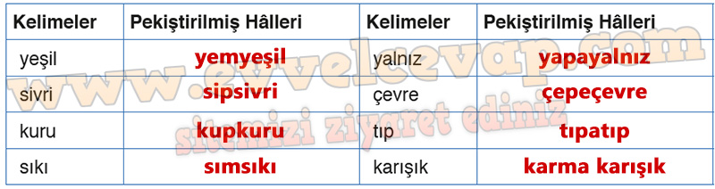 Soru: Edindiğiniz bilgilerden faydalanarak aşağıda verilen kelimeleri pekiştirerek yazınız. Kelimelerden beş tanesinin pekiştirilmiş hâllerini cümle içinde kullanınız.