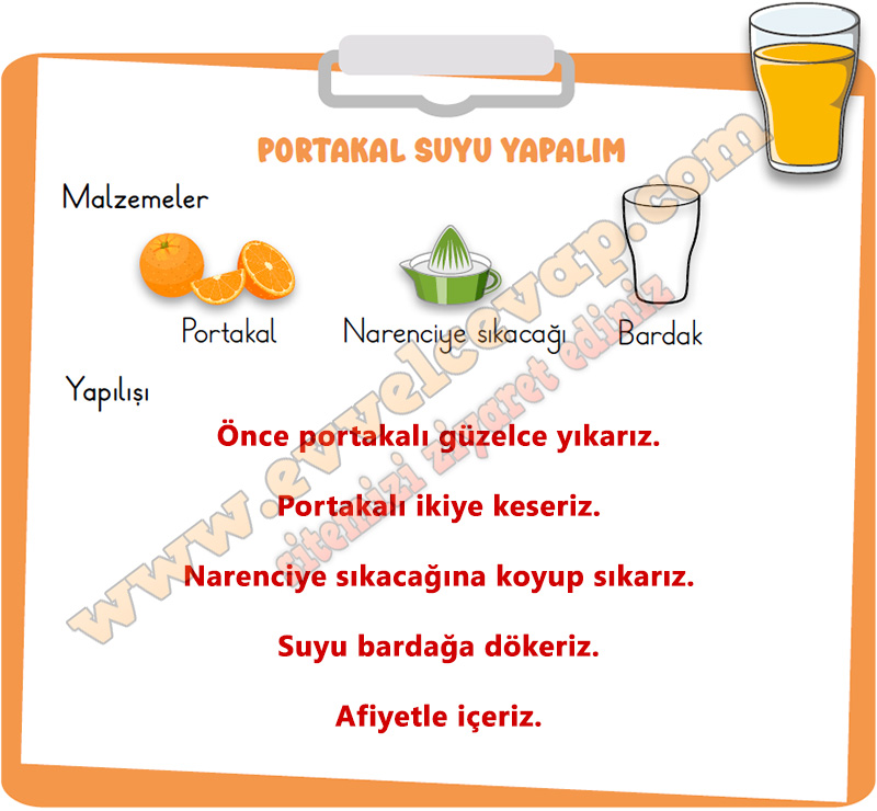 Soru: Taze sıkılmış portakal suyu hazırlayacağınızı düşününüz. Portakal suyunu hazırlama aşamalarını yazınız.