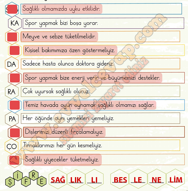 Soru: Sağlıkla ilgili doğru olan cümlelerin başındaki kutuları boyayınız. Boyadığınız kutulardaki heceleri sırasıyla yazıp şifreye ulaşınız