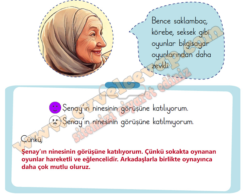 Soru: Şenay’ın ninesinin görüşüne katılıyorsanız gülen yüzü katılmıyorsanız üzgün yüzü boyayınız. Görüşe katılıp katılmadığınızın nedenlerini anlatınız ve yazınız.