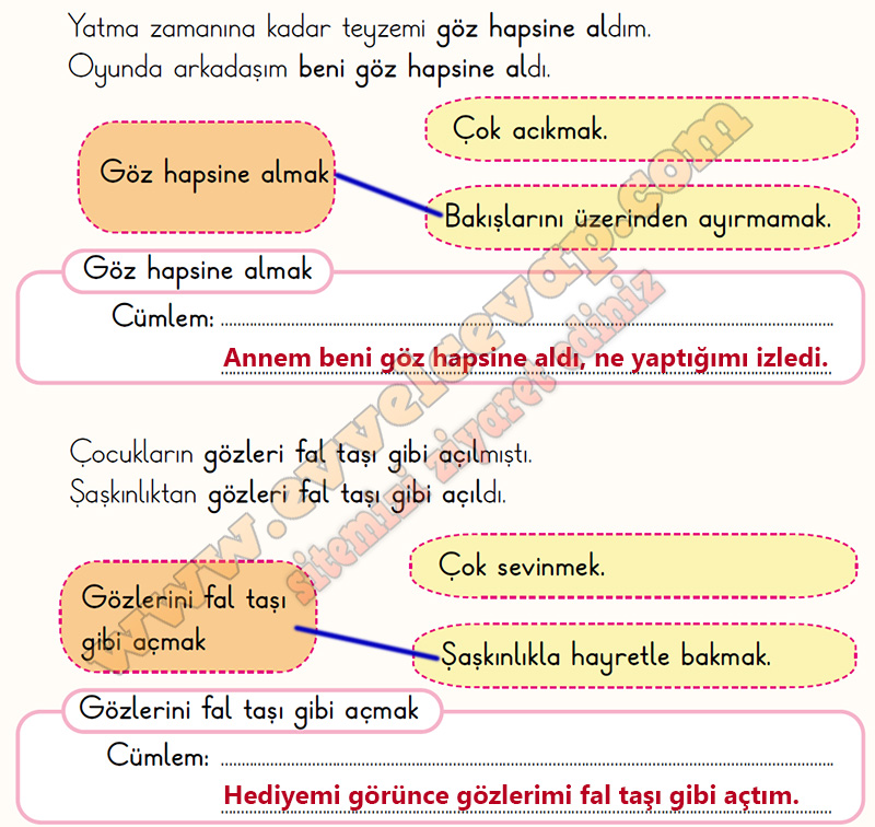 Soru: Koyu yazılmış sözcüklerin anlamını cümlelerden hareketle tahmin ediniz. Sözcük gruplarını anlamlarıyla eşleştiriniz. Yeni öğrendiğiniz sözcük gruplarıyla cümleler yazınız.
