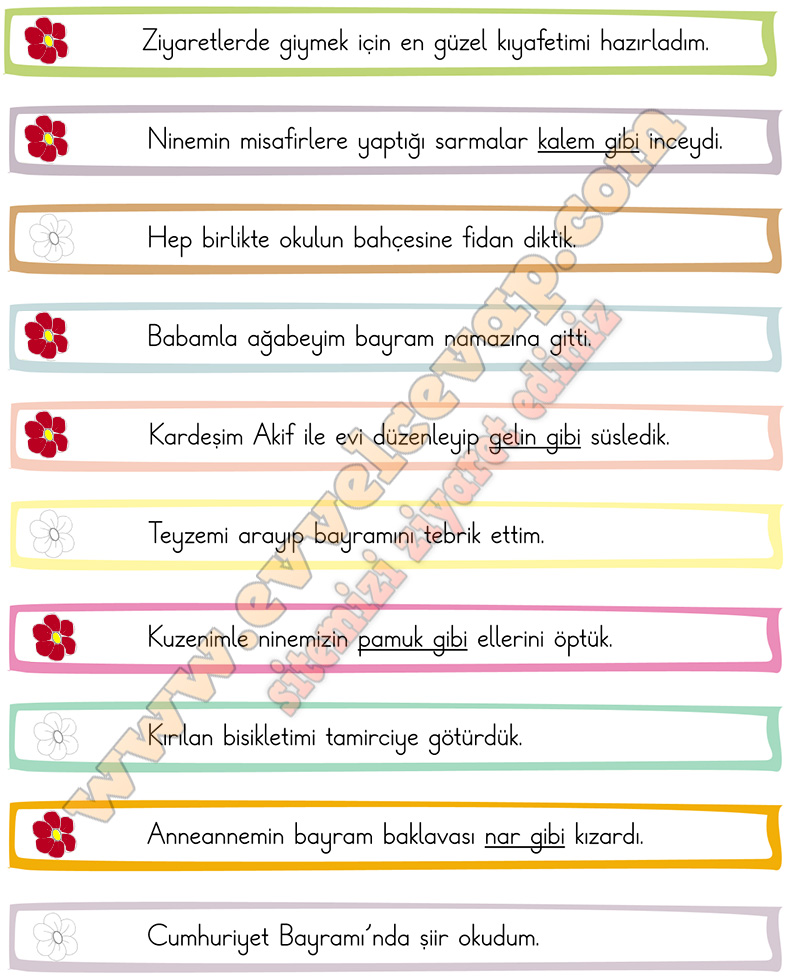 Soru: Dinî bayramlarımızla ilgili olan cümlelerin başındaki çiçeği boyayınız. Altı çizili ifadelerdeki gibi benzetmelere yer vererek bir bayram anınızı anlatınız.