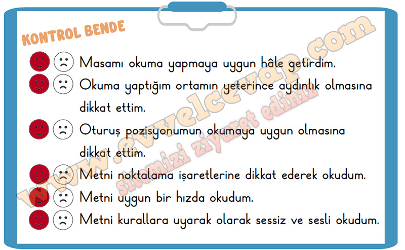 Soru: Okuma kurallarından uyguladıklarınız için gülen yüzü, uygulamadıklarınız için üzgün yüzü boyayınız.