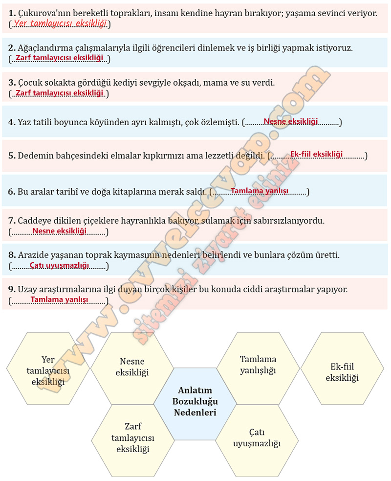 Soru: Aşağıda verilen cümlelerdeki anlatım bozukluklarının nedenlerini bulunuz. Bu nedenleri verilen boşluklara örnekteki gibi yazınız.