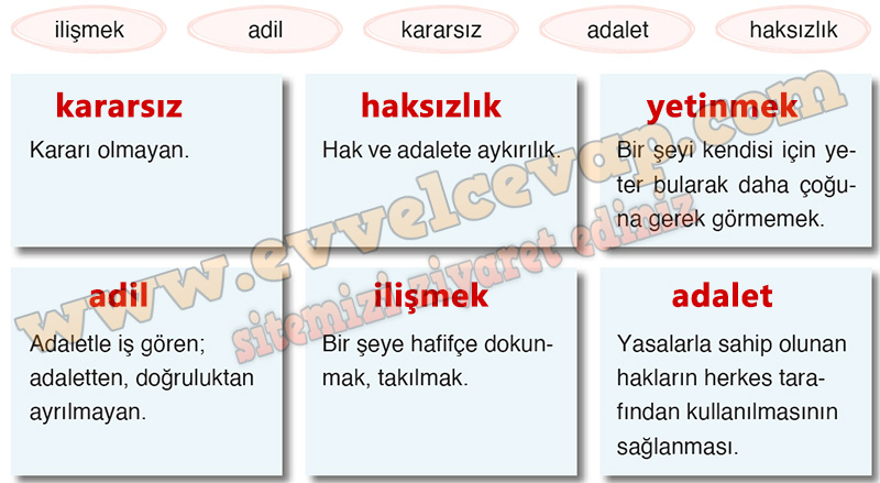 Soru: Aşağıdaki kelimelerin anlamlarını metinden hareketle tahmin ediniz. Bu kelimeleri anlamlarının yazılı olduğu kutucukların içindeki noktalı yerlere yazınız.