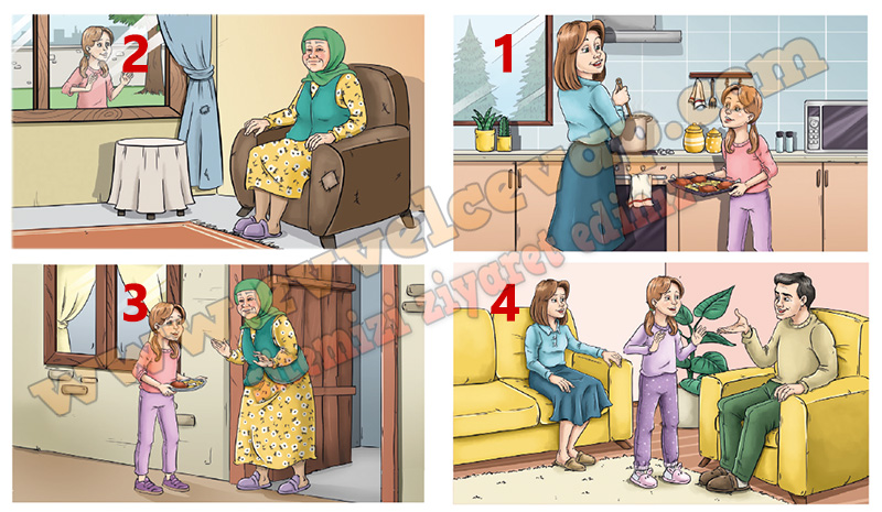 Soru: Aşağıdaki görselleri inceleyiniz. Görselleri oluş sırasına koyarak görsellerde anlatılan olayla ilgili kısa bir hikâye yazınız. Hikâyenizde kişi, olay, zaman ve mekân unsurlarına dikkat ediniz. Hikâyenize başlık koymayı ve hikâyenizi bitirdikten sonra kontrol etmeyi unutmayınız. Hikâyenizi arkadaşlarınıza okuyarak paylaşınız.