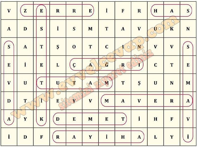 Soru: Aşağıda, metinden alınan bazı kelimelerin anlamları verilmiştir. Bu kelimeleri bulmacadan bularak örnekteki gibi renkli kalemlerinizle işaretleyiniz.