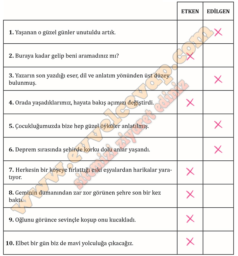 Soru: Aşağıdaki cümlelerin öznesine göre çatı özelliklerini belirleyerek örnekteki gibi ilgili bölümü işaretleyiniz.