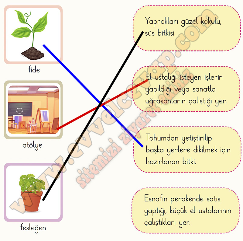 Soru: Görsellerden hareketle sözcüklerin anlamını tahmin edip sözlük anlamlarıyla eşleştiriniz.