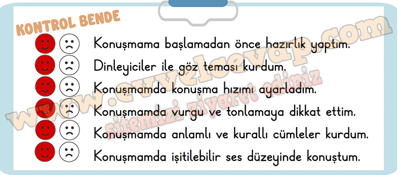 Soru: Konuşmanızı verilen kurallara yöre değerlendiriniz, uyguladığınız kurallar için gülen yüzü boyayınız. Uygulamadığınız kurallar için üzgün yüzü boyayınız.