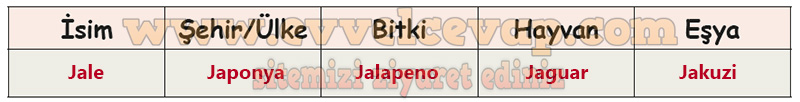 Soru: “İsim şehir” oyununu oynadığınızı ve “j” harfinin seçildiğini düşününüz. Aşağıdaki tabloyu bu harfle başlayan hangi kelimeler ile tamamlardınız? Yazınız.