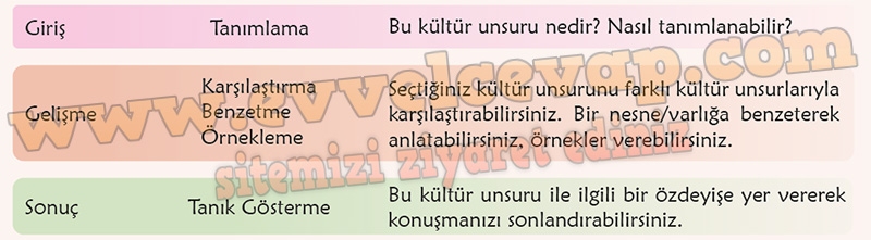 Soru: Kültür unsurlarımızdan (çay, Türk kahvesi, Türk kilimi, lokum, nazar boncuğu, el öpme vb.) birini seçerek bu unsuru yabancı misafirlere anlatacağınız bir konuşma yapınız. Konuşmanızı yaparken aşağıdaki tablodan faydalanınız.