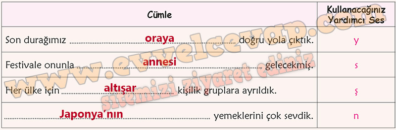Cevap: Türkçe kelimelerde iki ünlü yan yana gelmez, ünlü harflerle biten kelimeler ünlü harflerle başlayan ekler alırken “y, s, ş, n” yardımcı sesleri araya girer.