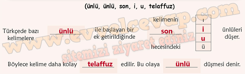 Cevap: Türkçede bazı kelimelere ünlü ile başlayan bir ek getirildiğinde kelimenin son hecesindeki “ı, i, u, ü” ünlüleri düşer. Böylece kelime daha kolay telaffuz edilir. Bu olaya ünlü düşmesi denir.