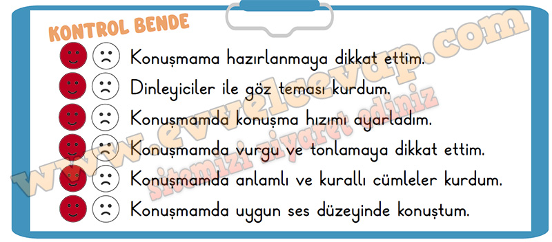 Soru: Konuşmanızı verilen kurallara göre değerlendiriniz. Uyguladığınız kurallar için gülen yüzü,, uygulamadığınız kurallar için üzgün yüzü boyayınız.