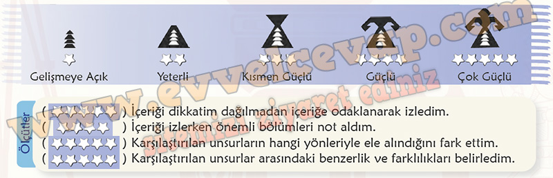 Soru: Dinleme/izleme sürecinizi aşağıdaki yıldızlı puan çizelgesini kullanarak değerlendiriniz. Ölçütteki her bir davranışı gerçekleştirme durumunuza göre yıldızlarınızı yay ayraç içine çiziniz.